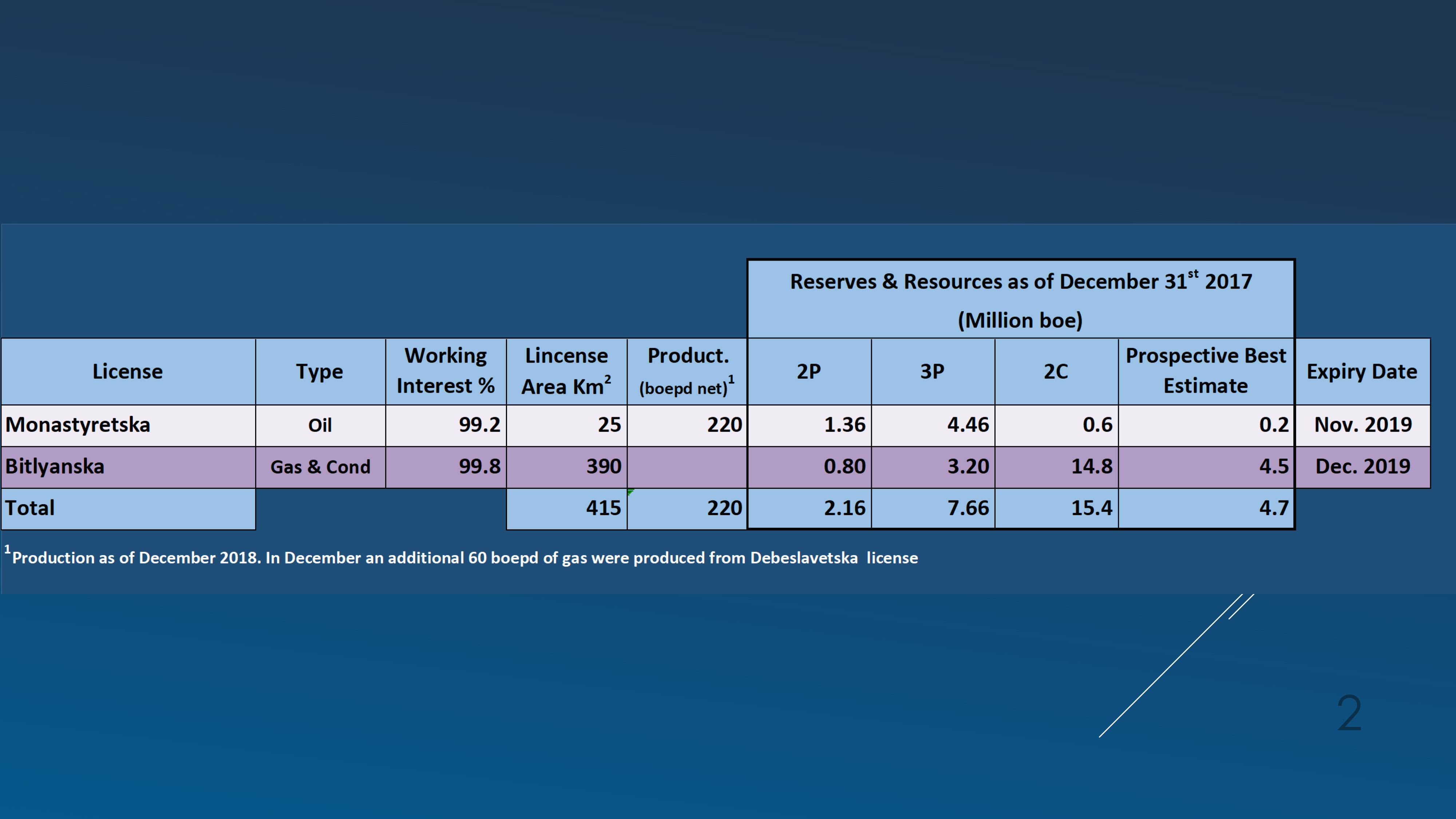 Reserves and resources associated with the Group’s licenses were evaluated and delivered in a final report dated March 2016. The evaluation was conducted in accordance with SPE Petroleum Resources Management System (‘PRMS’) by a Ukrainian consulting firm. Since then, reserves and resources have been updated to reflect the produced volumes. A summary is presented in the table below.